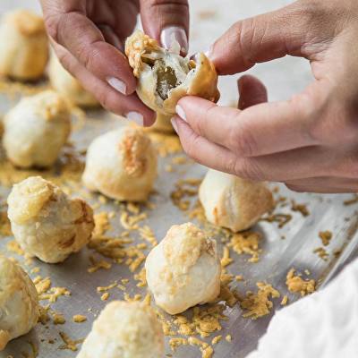 - Envolver aceitunas sin carozo o rellenas en tapas de empanadas copetín