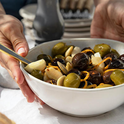- Mezclar las aceitunas negras y verdes con un puñado de tomillo fresco, aceite de oliva, ají molido, almendras peladas, dientes de ajo machacados, cascara de ½ naranja, vinagre