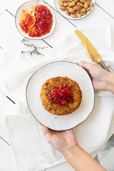 - Para el camembert, pasarlo entero por harina, después por 1 huevo batido con una pizca de sal y pimienta y una última parada, panko mezclado con un puñado de tomillo fresco y almendras picadas.