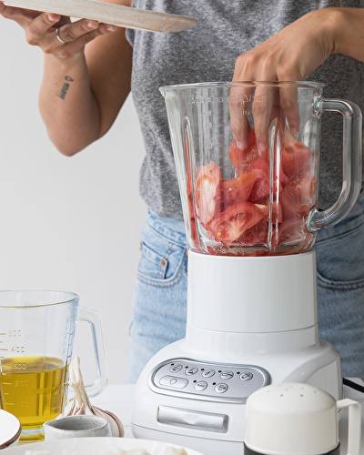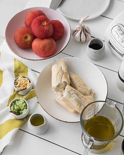 - En licuadora o vaso de mini pymer, poner el pan y los tomates cortados en trozos así no más. Agregar un chorrito de algún vinagre, 200 de aceite (si es de oliva, un lujazo), sal y 1 o 1/2 diente de ajo.