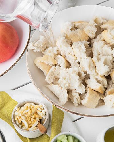 - Romper con las manos 200g de pan y mojar con agua fría hasta que ablande.