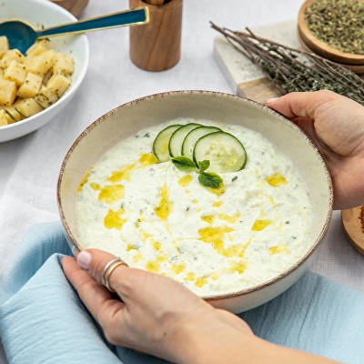 - Mezclarlo con el yogurt natural (si consiguen griego que es bien cremoso y espeso, genial), jugo de limón, ajo, oliva, pimienta, sal y menta fresca picada.